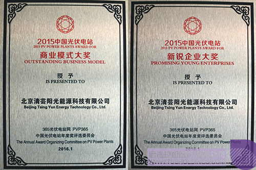 2015年,榮獲“中國光伏電站新銳企業大獎”、“中國光伏電站商業模式大獎”。